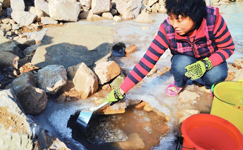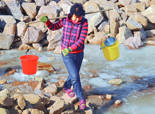 ??1月23日,北宅街道暉流社區居民李秋蘭在挑水。