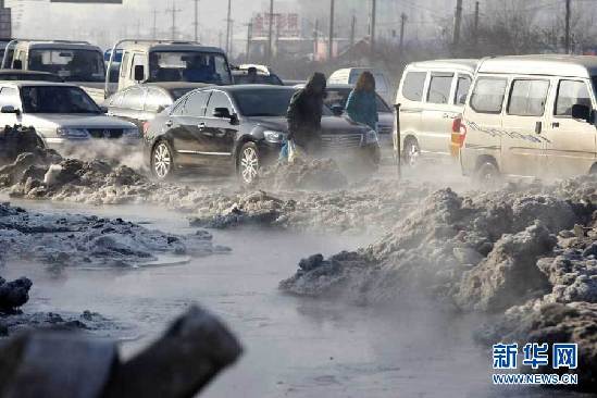 1月28日,車輛從長春市發生供水管線斷裂的街道上緩慢駛過。當日,吉林省長春市青州路與西環城路交會處一供水主管線斷裂,大量自來水外溢,造成附近街道路面結冰,途經車輛嚴重受阻,給行人出行帶來不便。截至目前,當地有關部門仍對管線進行搶修。新華社發(周軍)