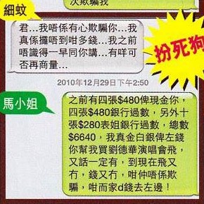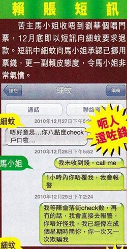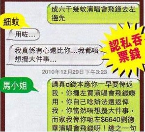 近日,再有一名苦主馬小姐聲稱經“細蚊”訂了十張價值280元以及八張價值480元的劉德華個唱門票,合共6640元,結果她和“棉花糖”一樣既拿不到票也拿不回錢。馬小姐出示了她和“細蚊”的短信互發記錄,稱“細蚊”承認已把買票錢都花光了:“聽說這一次她總共騙了超過5萬元。”