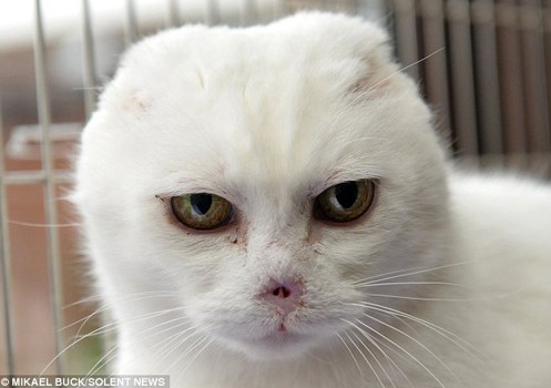 ????這只名為Charlie的貓咪因為得了皮膚癌而不得不接受手術,切除了兩只耳朵和部分鼻子,它怪異的外表和詭譎的目光嚇退了不少寵物愛好者。