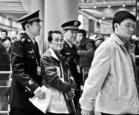 2月17日下午,中國通緝犯曾漢林(左二)乘坐從加拿大多倫多起飛的航班被遣返回國,抵達北京首都國際機場。新華社發