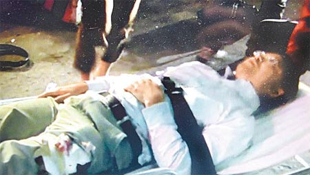 被開槍打傷左大腿劫車的蔡佳峰送醫時,一臉痛苦