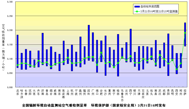 ????環(huán)境保護(hù)部(國(guó)家核安全局)有關(guān)負(fù)責(zé)人今日介紹說(shuō),環(huán)境保護(hù)部(國(guó)家核安全局)3月21日16時(shí)繼續(xù)發(fā)布全國(guó)省會(huì)城市和部分地級(jí)市輻射環(huán)境自動(dòng)監(jiān)測(cè)站實(shí)時(shí)連續(xù)空氣吸收劑量率監(jiān)測(cè)值。監(jiān)測(cè)結(jié)果匯總圖中綠色曲線代表監(jiān)測(cè)值,藍(lán)色柱體代表天然本底水平,綠色曲線均在藍(lán)色柱體范圍內(nèi)。監(jiān)測(cè)結(jié)果表明我國(guó)環(huán)境輻射水平未受到日本核電事故的影響。