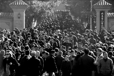 上午9點,八寶山公墓周邊各停車場陸續停放了5000多輛車。考慮到八寶山周圍道路的擁堵比較明顯,9點左右,石景山交通支隊按照預案迅速打開雕塑園中街的停車場和嘉年華停車場。石景山路和上莊大街的中心護欄也被臨時打開,以便司機直接左轉。“革命公墓院里的停車場已經滿了,很多人為了等著進去,就在門口排隊,對正常交通的影響很大,所以只能讓他們分流。”石景山交通支隊交通科科長谷京告訴記者。