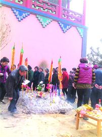 ????昨日12時左右,圓墳儀式開始,幾十名祭拜者排成隊圍著墳堆轉圈,隨后都到墳前磕頭許愿。 “這可是多少輩子才能看到的事,狐仙保佑著我們這里,平度、城陽都下雹子,就我們這不下,都是狐仙的功勞。”一名七旬老太告訴記者。