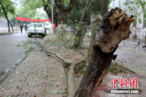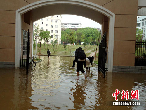 15日下午,南昌市普降大雨,伴有雷電和短時大風(fēng),局部降下冰雹。華東交通大學(xué)許多新栽種的樹木被強(qiáng)風(fēng)吹倒,部分學(xué)生宿舍進(jìn)出道路被淹沒,大學(xué)生們只能脫鞋趟水行走。