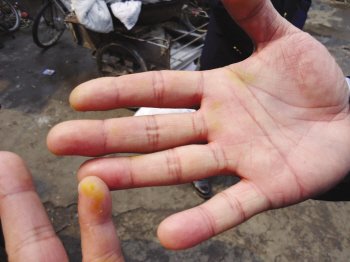 摸過玉米饅頭的手被染黃。 溫州商報 云畢 攝