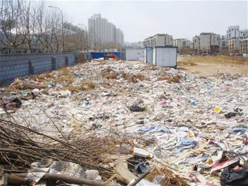 在鎮(zhèn)江北路北仲二小的馬路對面,有一處待開發(fā)的建筑工地,工地廣告牌圍擋后邊各種建筑垃圾和生活垃圾成堆,走在人行道上很容易就看到廣告牌后裸露的垃圾。