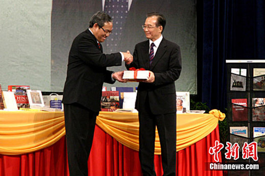 當地時間4月27日,正在馬來西亞進行正式訪問的中國總理溫家寶參觀馬來亞大學并與師生交流。參觀結束后,溫家寶向該校校長贈送圖書。中新社發周兆軍 攝