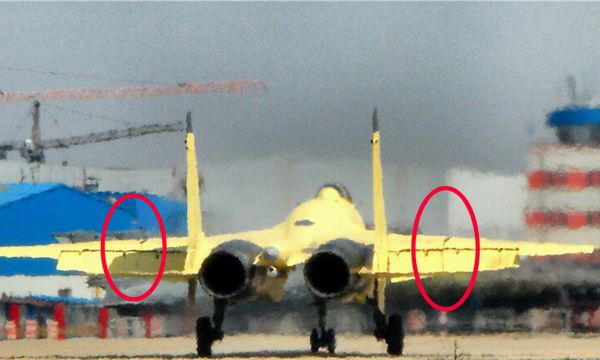 環球網資料圖:網友拍攝的殲-15試飛圖可折疊機翼折縫清晰可見。