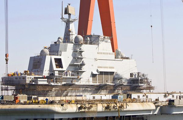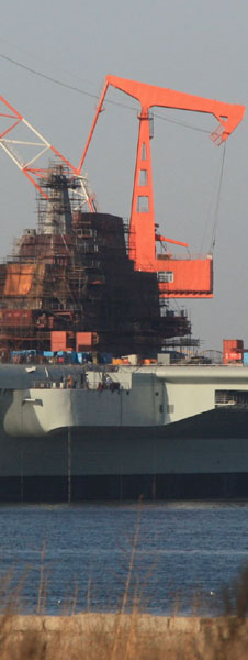 資料圖:一些網絡軍事論壇紛紛登載了在中國大連造船廠改建的“瓦良格”號航空母艦的照片。