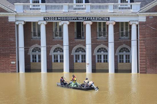 美國密西西比河沿岸多地遭洪水威脅:孟菲斯洪水70年一遇;伊利諾伊和密蘇里州已遭洪水;阿肯色、密西西比和路易斯安那州超危險水位。圖為5月11日維克斯堡洪峰直逼紀錄。