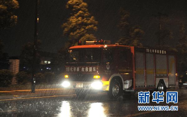5月20日,救援車從富士康集團鴻富錦成都公司拋光車間爆炸事故現(xiàn)場駛過。新華社記者李橋橋攝