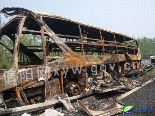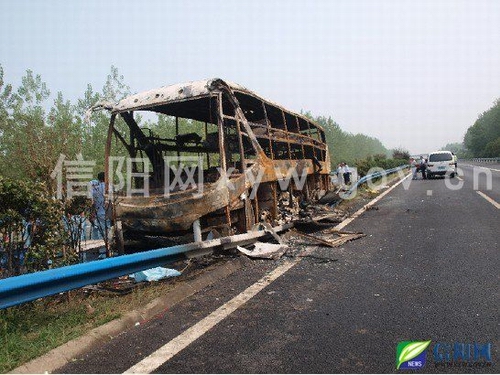 ????據信陽市公安局介紹,救出的6人中包括駕駛員,其為中度燒傷。該客車是一輛從威海到長沙的雙層臥鋪客車。目前,其余尸體已經被燒至炭化,無法辨別尸體,只有通過DNA驗證才能辨別尸體的身份和人數。
