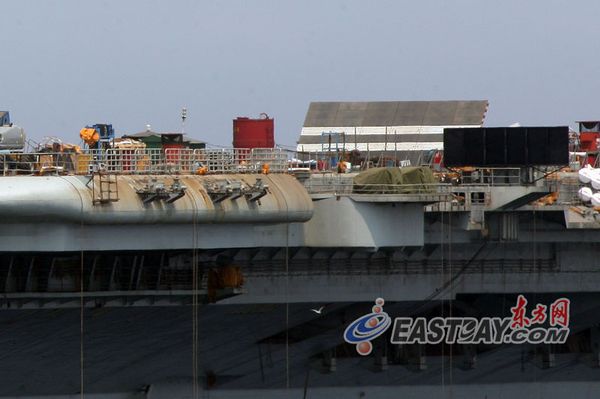 資料圖:圖中紅色的柱子疑似艦載飛機降落時起到決定性作用的阻攔索的硬件設備也已基本到位。