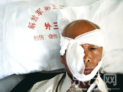 “只聽見‘嘭’的一聲,就感覺‘氣浪’向我沖過來,我下意識地想到壞人搞爆炸了。”81歲的許楨安大爺因右眼傷勢較重、失血過多,被轉到了外三科44床留院觀察。許大爺頭上纏著厚厚的繃帶和紗布,右眼被包裹得嚴嚴實實,米色細格子襯衣上的血漬已干涸變黑。