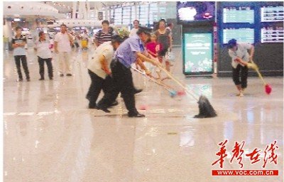 17:40,網友is羅羅發微博稱,“長沙黃花機場新航站樓掃水忙!大水沖進航站樓啦!”并附有保潔員在大廳“抗洪”清掃積水的圖片。
