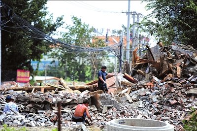 孟老太家的平房被拆后,工人在現(xiàn)場(chǎng)清理。