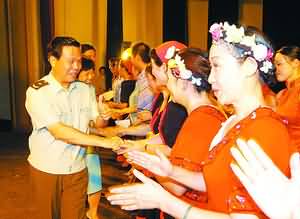 資料圖:駐廈某集團軍首長蔡英挺等領導親切會見參加慰問演出的演員。