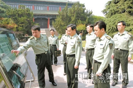 資料圖:南京軍區檔案館館長朱蒙生(左)向軍區參謀長蔡英挺(中)、軍區司令部辦公室主任方要紅(右)介紹軍區檔案館改造方案。