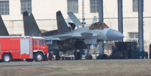 更多的圖片透露了殲-15更多的細節,除了強化型后輪起落架、強化型雙輪前起落架、縮短了的尾椎與原裝的蘇-33如出一轍之外,折疊翼、光電雷達的位置也完全相同,光電雷達也許是中國生產的。