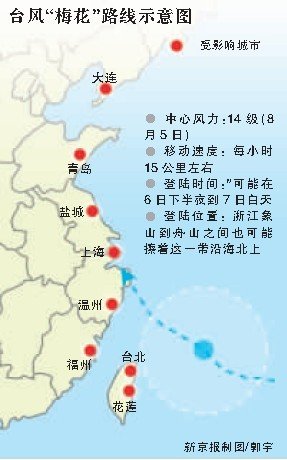 本報訊(記者金煜)今年最強臺風“梅花”可能于今天夜間到明天白天在浙江臺州到江蘇啟東一帶沿海登陸,也可能擦著這一帶沿海北上,影響山東和華北東部,威力將波及十余個省市區。昨日,中國氣象局發布臺風橙色預警。