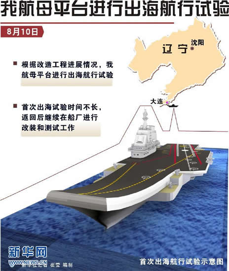 新華社10日發(fā)布消息:根據(jù)改造工程進展情況,8月10日我航母平臺進行出海航行試驗。按照試驗計劃,首次出海試驗時間不會太長,返回后將繼續(xù)在船廠進行改裝和測試工作。