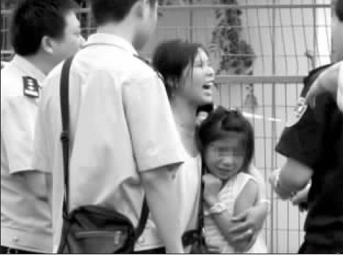 案發現場附近,媽媽抱著剛剛遭遇劫持的女兒。據揚子晚報