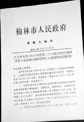 9月23日,記者在神木縣國(guó)土局了解到,今年4月,陜西省政府以“陜政函【2011】75號(hào)”批準(zhǔn)了該土地利用總體規(guī)劃作為城市建設(shè)用地,縣城規(guī)劃已將該區(qū)域納入新的城市規(guī)劃范圍。截至目前,該縣共上報(bào)省市政府審批土地 5373.63畝,已供地 3448.605畝,正在建設(shè)或建成的項(xiàng)目均已取得合法用地手續(xù)。