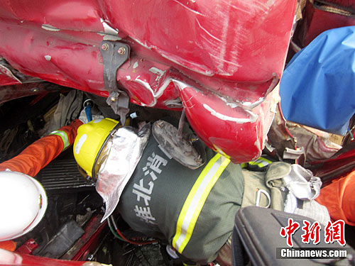 貨車駕駛室內駕駛員大腿部被卡,在嚴重變形的駕駛室里動彈不得,另外一名司機被卡在駕駛座上。他說,當時高速路上出現團霧,他打開了霧燈,也把車速降低了,正在行駛時,前面的車一下停住了,自己踩著剎車還是撞了上去,他的頭撞在方向盤上,窗戶玻璃已被震碎,引擎蓋變形,他自己也是滿臉血跡。