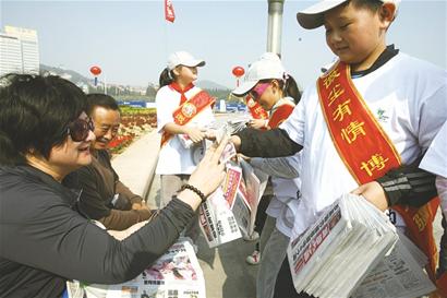 早報(bào)義工團(tuán)的小朋友們在讀者節(jié)活動現(xiàn)場義賣早報(bào)