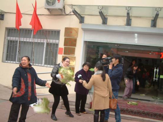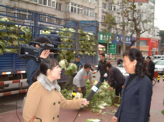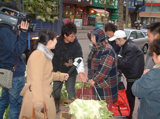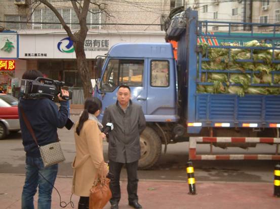 青島電視臺采訪來領取愛心大白菜的困難戶 |