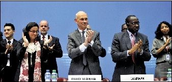 世貿組織總干事拉米(中)和與會人員起立鼓掌慶祝俄羅斯加入世貿組織。