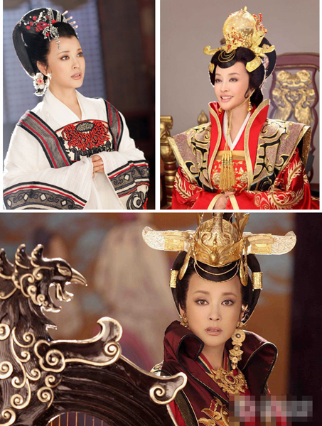 1995年內地版本是最為尊重歷史的,當年已44歲的劉曉慶使出渾身解數,硬是一個人把武則天從小演到老。劉氏武則天形象和實際生活中的她頗為相似,都給人一種惟我獨尊的感覺。當時的劉曉慶顯得富態,服裝造型上稍顯“艷俗”。時隔15年后在《日月凌空》重劉曉慶再度出演武則天,這次在服裝造型上可以用金碧輝煌來形容,盡顯奢華貴氣。