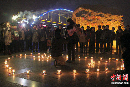 12月24日是西方傳統節日平安夜,在蘭州黃河岸邊,寒風刺骨,一男青年在朋友的幫助下向女友浪漫求婚,引得路人駐足圍觀。張道正 攝