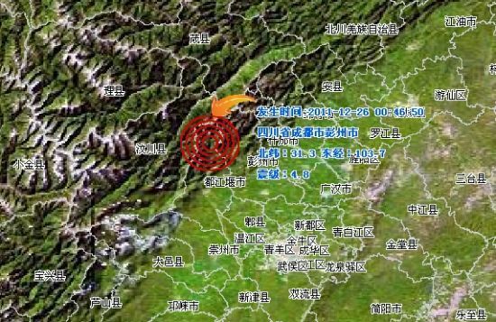 四川省成都市彭州市(北緯31.3,東經103.7) 發生4.8級地震