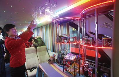 早報訊 坐在舒適的真皮沙發里,端著美味的紅酒品味,耳旁是動感富有節奏的音樂,窗外是島城迷人的夜景,晚上只要登上都市觀光巴士就能享受到這美好的一切。昨日下午,交運集團在旅游汽車站舉行都市觀光3線開通儀式,記者隨后登上雙層巴士游覽島城夜景。據悉,為契合都市觀光3線夜巴士的主題,交運溫馨巴士特別量身定做了車廂內飾,通過懸掛在車頂的酒杯、載滿飲料的迷你吧臺、富有動感節奏的音樂等元素,把都市觀光巴士車廂打造成流動酒吧,給乘客置身于飛機貴賓艙的感覺。
