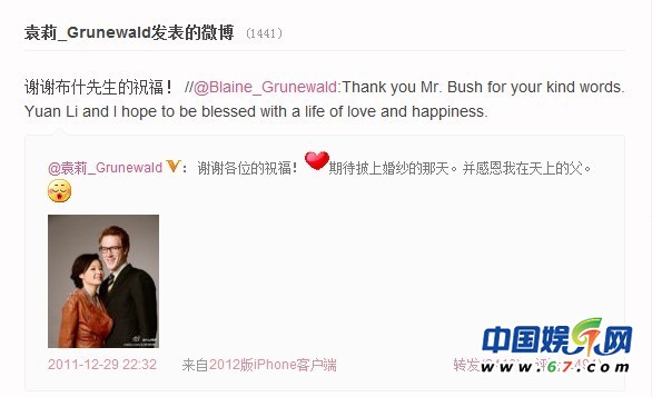 近日,突然閃電結(jié)婚的袁莉收到了來自美國前總統(tǒng)的祝賀,在微博上,袁莉高調(diào)感謝來自布什總統(tǒng)的祝賀。并表示期待穿上婚紗,舉辦婚禮的時(shí)刻。