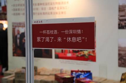 (展位“休息吧”指示牌) 筆者采訪了其中一位工作人員,他介紹道:我們的冷金香荔枝酒以荔枝鮮果為原料,以深圳荔枝文化為背景,是通過公司專利技術(shù)百分百荔枝原漿發(fā)酵釀制而成的,是深圳人自己的品牌酒,人們對(duì)其口感、營(yíng)養(yǎng)價(jià)值、檔次都非常認(rèn)可,在此次展會(huì)上賣得非常火爆。 像冷金香荔枝酒這樣的參展商非常多,他們都以情感元素為出發(fā)點(diǎn),從情感上抓住消費(fèi)者的內(nèi)心,引發(fā)他們的共鳴;也使得此次展會(huì)不僅是一次年貨商品買賣的場(chǎng)所,更是一種感受新年氣息的享受。