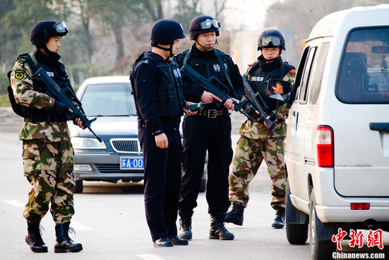 1月11日,南京下關(guān)“1·6”持槍搶劫殺人案發(fā)已過去6天。目前,南京警方仍全城布控,萬余警力正開展“地毯式”布控查緝相關(guān)犯罪嫌疑人。圖為持槍特警武警路面盤查。中新社發(fā)黑松子 攝