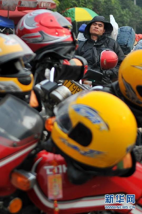1月11日,在321國道廣西廣東交界路段,一名駕駛摩托車返鄉(xiāng)的外出務(wù)工者停車休息。 隨著廣東珠三角工廠春節(jié)前相繼放假,一批批打工的人們采取騎摩托車的方式返回家鄉(xiāng)。他們匯成的“摩托大軍”成為春運(yùn)路上一道別樣的風(fēng)景。新華社發(fā)(何鎏攝)