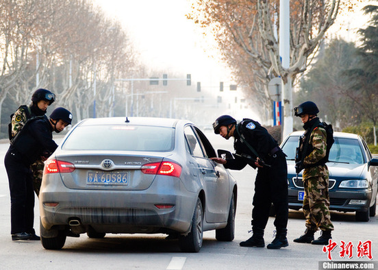 1月11日,南京下關“1 6”持槍搶劫殺人案發已過去6天。目前,南京警方仍全城布控,萬余警力正開展“地毯式”布控查緝相關犯罪嫌疑人。圖為持槍特警武警路面盤查。(中新網)