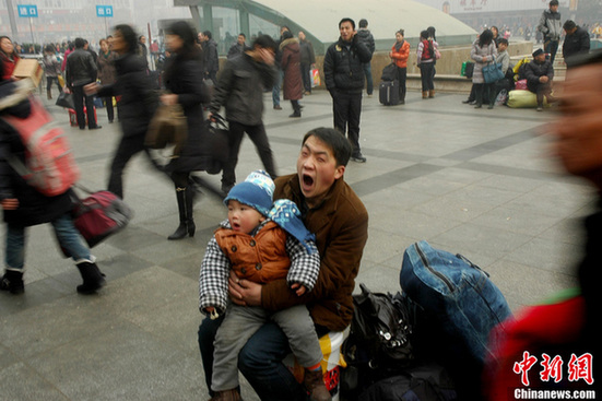 隨著前期購票的旅客進(jìn)入出行高峰階段,加上臘月二十三“小年”到來,全國迎來春運(yùn)第一個(gè)小高峰。1月15日,鄭州火車站廣場,在外務(wù)工的農(nóng)民工子女在大人的帶領(lǐng)下,乘車返鄉(xiāng)。中新社發(fā)楊正華 攝