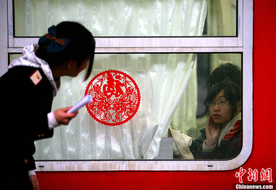 隨著前期購票的旅客進(jìn)入出行高峰階段,加上臘月二十三“小年”到來,全國迎來春運(yùn)第一個(gè)小高峰。圖為1月15日,乘客在南京火車站乘坐南京西開往廣州的K527次旅客列車,列車車窗上張貼的窗花,為回家過年的旅客帶來節(jié)日的溫情。中新社發(fā)鐘山 攝