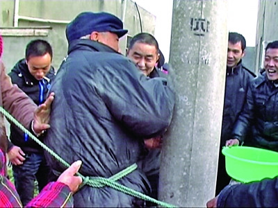 兩位媒人被綁在電線桿上,冷水泡腳。 葉方龍 攝 兩個媒人13日從南京六合帶著男方迎親車隊去女方老家南通如皋接新娘時,由于所帶的喜煙喜糖未能滿足附近村民的要求,竟被當地人綁在電線桿上,并用冷水泡腳,見拿來喜煙,被折騰得夠嗆的兩個媒人才被松綁。新郎后來一打聽,這是當地迎親的一個習俗,只好作罷。 13日上午7時,家住南京六合區的新郎王先生跟隨兩個媒人朋友興沖沖乘著花車去南通如皋縣接新娘。大約上午8時,迎親車隊來到女方家門口,一個小伙、一個中年人兩名媒人搶先下車前去敲女方家的門,準備接新娘,這時,附近鄰居和前來看熱鬧的路人將兩個媒人團團圍住,索要喜煙喜糖,兩個媒人給每個村民和路人都敬了一支煙和一把喜糖,本以為應付一下“意思意思”就算了,哪知,附近村民鄰居認為兩個媒人喜煙給得太少,按當地規矩,還應再拿出一條煙散給圍觀的村民和左右鄰居。兩名媒人趕忙解釋,男方家帶來的煙沿途都散光了,目前身上確實沒有了,事后再補上。 “不行就是不行!”圍觀看熱鬧的人不依不饒,見兩媒人軟磨硬泡就是不松口,便找來3米長手指粗的尼龍繩,幾個人三下五除二將兩個媒人捆綁在女方家門口的一根電線桿上,約5分鐘后,圍觀村民見兩媒人被綁后仍“不思悔改”,于是有人端來一臉盆涼水,眾人一起動手,脫下媒人一只腳的鞋子和襪子,將腳放入冰冷的水盆里浸泡,大家見媒人不覺得冷,又繼續給臉盆里加入涼水。兩位媒人被折騰得夠嗆,急壞了一旁等著的新郎。眼看還有數百里的路要趕,中午之前要接回新娘恐怕時間來不及,王先生趕忙找到岳父大人商量對策。最終,新娘父親找到圍觀看熱鬧的鄰居和村民,一邊打招呼,一邊賠笑臉,新郎也立即從附近小店買來一條香煙,遞給當地鄰居,大伙這才肯罷休,拿到煙后,大伙兒便給兩個媒人松了綁,穿上鞋,讓他們進了屋。 新郎見好友媒人因此遭罪,起初有些不悅,但岳父絲毫不生氣,反而解釋說,街坊鄰居稱這是一種鬧親習俗。接新娘不鬧不熱鬧,越鬧越覺得有面子,越鬧越代表今后的日子紅紅火火。新郎小王告訴記者,對這種綁人、冷水泡腳的鬧法,兩名媒人也是第一次遇到,有些不適應。圍觀的一些年輕人稱,即便如此,鬧喜事也不能太過火,新春佳節喜事多,鬧喜事的可別只顧自己痛快,不顧別人感受。 |