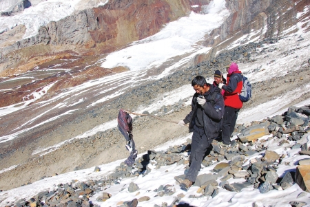 “我們在海拔4700米的區域繼續搜尋,在下午3點30分左右,發現了一件藍色外套。”救援隊成員說,衣服旁邊的雪地上,還有一些血跡。順著血救援隊伍上山搜救跡繼續尋找,救援隊成員在10多米開外的地上,找到了一具尸體。“經現場初步判斷,這具尸體是從700多米的高空下滑墜的,和楊某所說的意外發現地在三峰峰頂附近,是相吻合的。”
