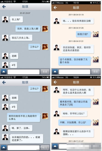 模特曹思陽隨后也更新了一條微博,并放出了私信的截屏。從圖片內(nèi)容上來看,疑似陸琪挑逗曹思陽的內(nèi)容。在詢問對(duì)方是否有男友后,陸琪表示:“你應(yīng)該知道,其實(shí),我對(duì)你是有點(diǎn)意思的。” 模特王真熒也發(fā)了一條附有私信截屏的微博,并表示:“是時(shí)候把你陸琪拉出來曬曬太陽了”從私信截屏上看,內(nèi)容大意疑似陸琪想去上海時(shí)約對(duì)方。