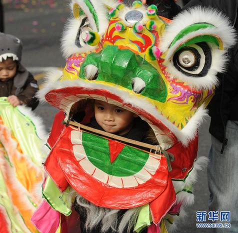 2月4日,在美國紐約,一名小朋友身披舞獅道具參加新春游行慶祝活動。