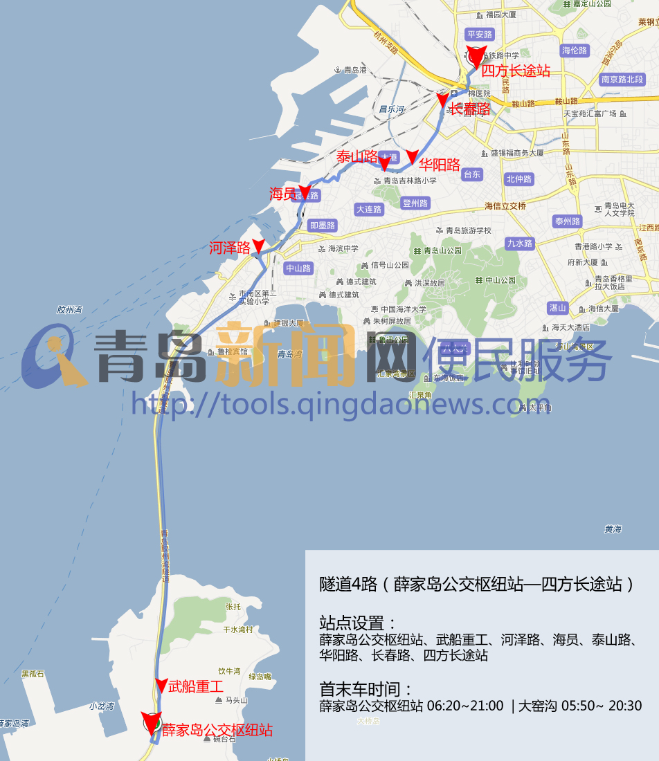????站點設置:薛家島公交樞紐站、武船重工、河澤路、海員、泰山路、華陽路、長春路、四方長途站