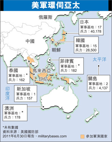 美軍環伺亞太 中新網2月7日電 據香港《文匯報》報道,由美國及泰國主導的第31次“金色眼鏡蛇”軍事演習7日將在泰國展開,持續至本月17日。除了美泰兩國,參加的還有新加坡、日本、韓國、印度尼西亞及馬來西亞,總人數達1.3萬,是亞太地區迄今最大規模的多國軍演。分析認為,隨著美軍積極部署重返亞太,美軍在西太平洋大舉增兵,并接連舉行聯合軍演,目的是威懾中國。 軍演中另有多國受邀參與策劃,包括澳大利亞、法國、加拿大及英國等10國,而俄羅斯、中國、新西蘭、荷蘭等9國則以觀察國身份參加。據泰軍消息透露,緬甸也曾謀求參與,卻遭到美國國會拒絕,只能以觀察國身份派出數名軍官觀摩演習。 據泰方介紹,軍演內容涵蓋反恐、人道主義救援、指揮演習、包括實彈訓練和非作戰疏散演習的野戰演習,以及維和任務演練等。美國海軍將出動船塢登陸艦“日耳曼城”號及“托爾圖加”號、CH-46海武士直升機等多種軍機、通用登陸艇,以及M-777牽引榴彈炮。 從2010年起派兵參加“金色眼鏡蛇”的韓國,今年派出登陸突擊裝甲車(KAAV)及2,600噸級登陸艦“香爐峰”號,以及320名海軍和陸戰隊官兵參與;日本則派出約70人參加。 美軍過去一年在亞太連環舉行聯合軍演,覆蓋整個西太平洋地區之余,演習時間近乎貫穿全年。這勢必影響地區安全和區域合作,直接結果是令區內成為新的海軍軍備競賽場,令不少國家擔憂。美軍又不斷增加及調整亞太軍事布局,目前已在跟新加坡、印度尼西亞、馬來西亞等國談判,試圖在這些國家設立無人偵察機基地,并已制訂計劃,把約1.5萬士兵由沖繩調到澳洲及亞洲。 美國防部上月曾聲稱,新軍事戰略并非企圖遏制中國,但美國總統奧巴馬早前公布的新軍事戰略報告卻與這種說法稍有出入。今年美海軍作戰部宣布,將把海軍1/3戰艦轉移至西太平洋,意味著日后西太平洋靠近中國一側的美軍戰艦數目將近100艘,相當于海軍半數兵力。 資料:美軍2011年頻繁染指亞太 東南亞 “金色眼鏡蛇2011”多國軍演(1月7日至2月18日) 地點:泰國 “肩并肩”美菲軍演(4月6日至15日) 地點:菲律賓 美菲海上聯合戰備訓練演習(6月28日) 地點:菲律賓 南亞 “和平”海上多國軍演(3月8日至12日) 地點:巴基斯坦附近海域 東亞 “關鍵決心”美韓軍演(3月8日至18日) 地點:韓國 “乙支自由衛士”美韓軍演(8月16日至26日) 地點:韓國 “可汗探索”多國軍演(7月31日至8月12日) 地點:蒙古 中亞 “草原之鷹”聯合軍演(8月8日,為期3周) 地點:哈薩克斯坦 |